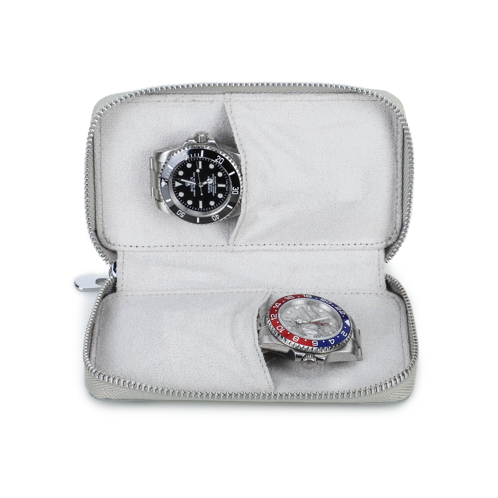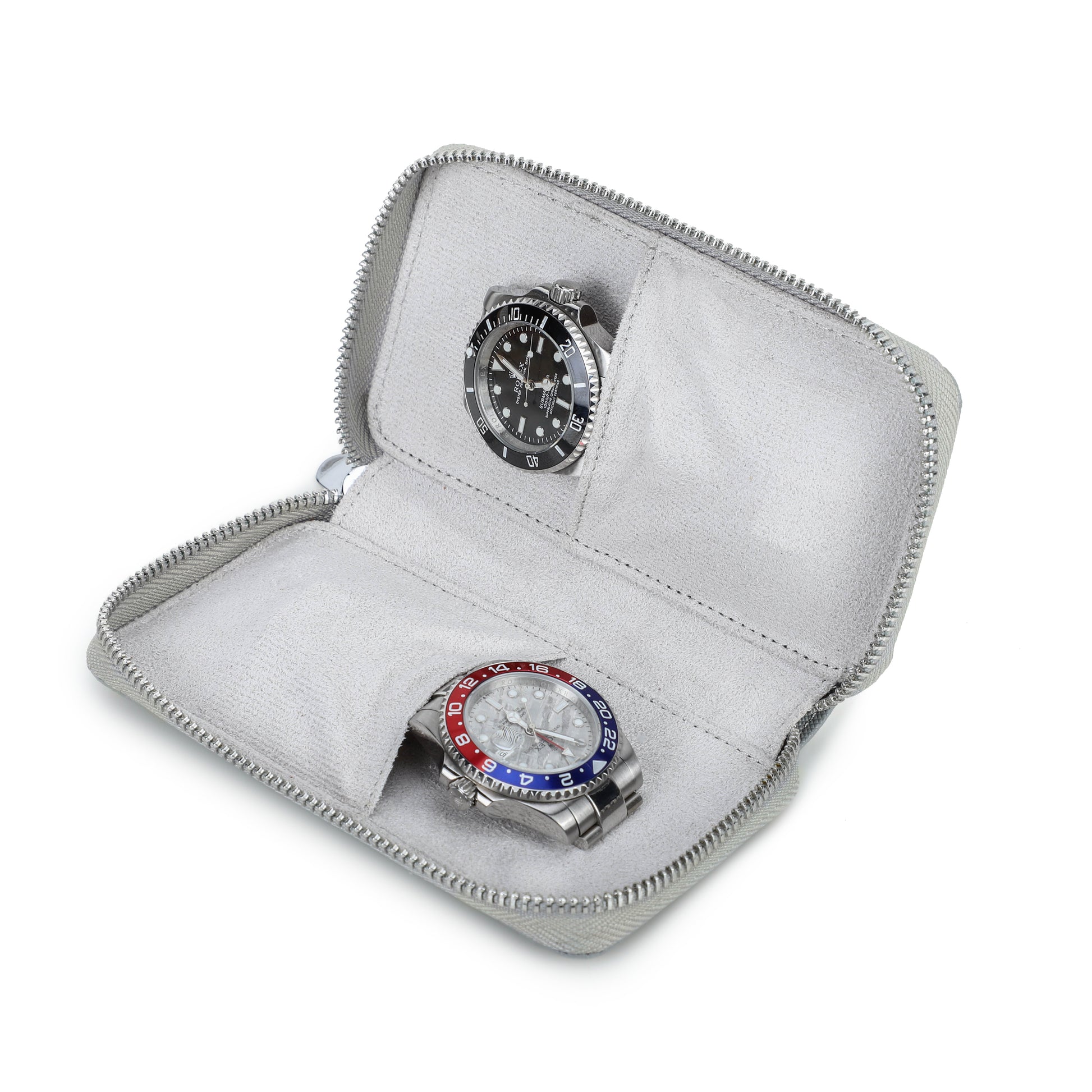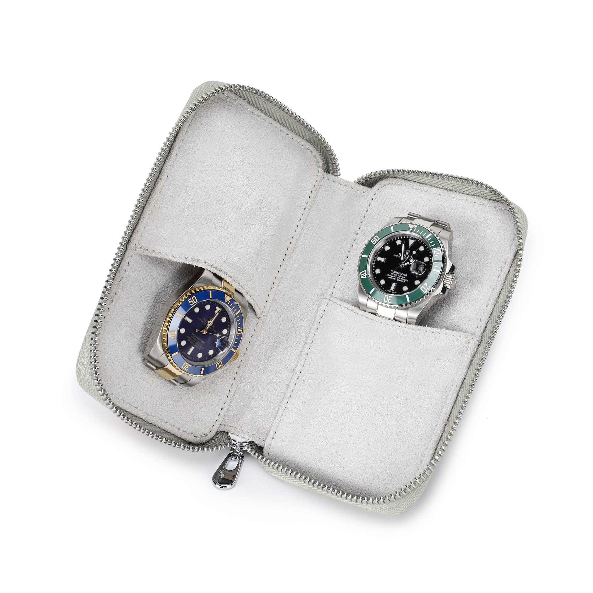 De Timezone Etui is ontworpen om twee horloges veilig op te bergen. Het reisetui kan worden afgesloten met een robuuste ritssluiting, wat ervoor zorgt dat de etui gedurende uw reis veilig dicht blijft.