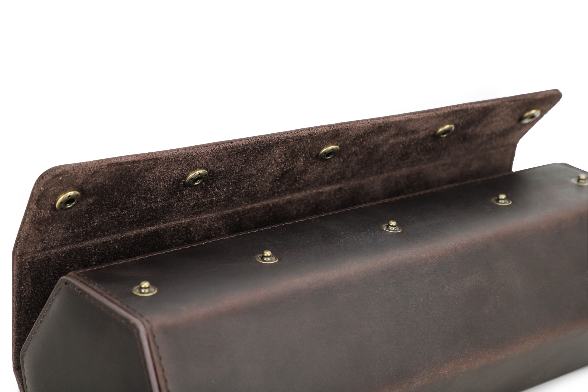 Deze horloge rol is ontworpen om vier horloges in op te bergen. Het horloge etui is handgemaakt van stevig, maar stijlvol pilotenleer. De binnenkant is voorzien van alcantara suède. De huiden zijn afkomstig van runderen en worden in een looierij afgewerkt. Deze leersoort is door en door geverfd, opgeschuurd en voorzien van een finish. Dit leer heeft een pure uitstraling. De stiksels geven het product een stoere en robuuste afwerking.