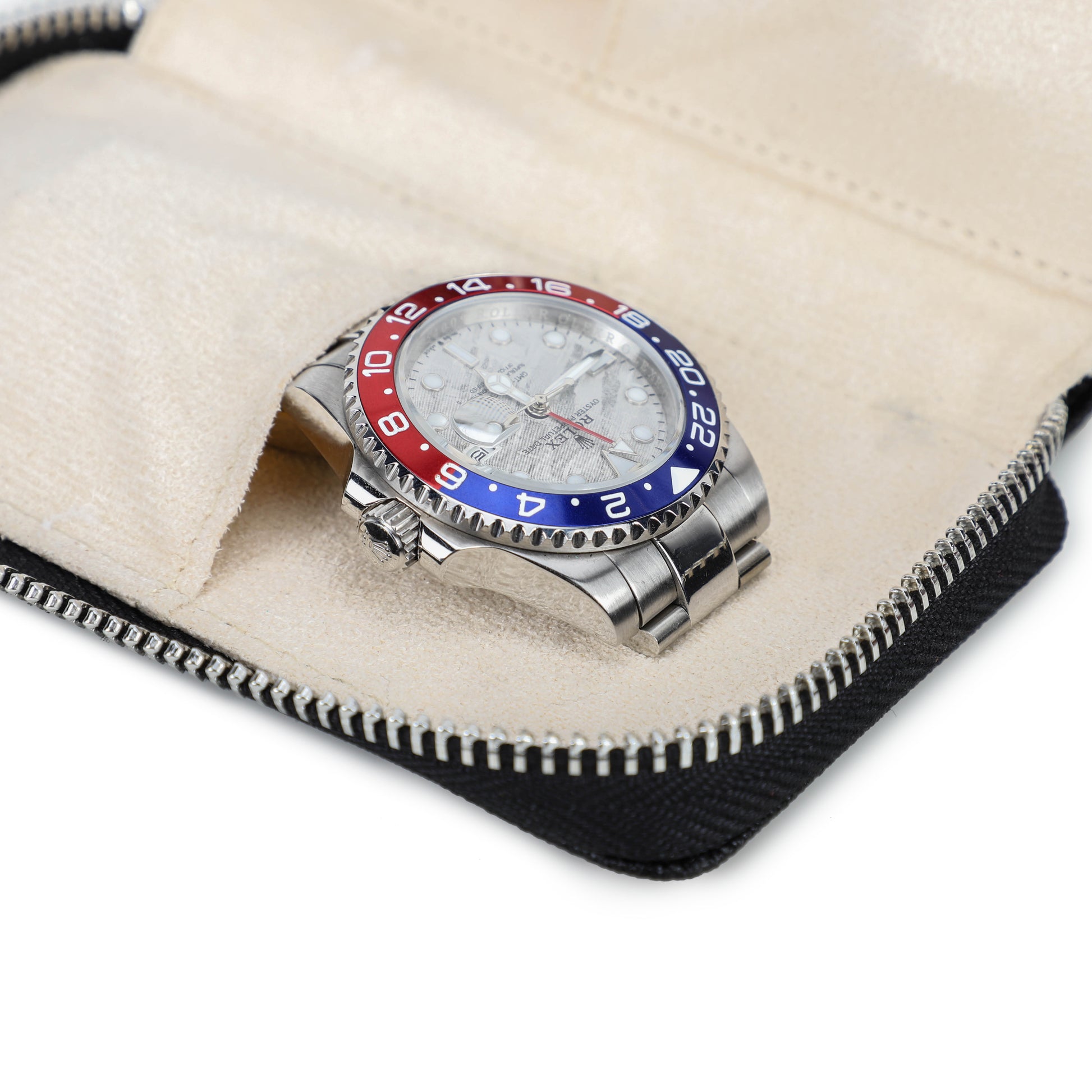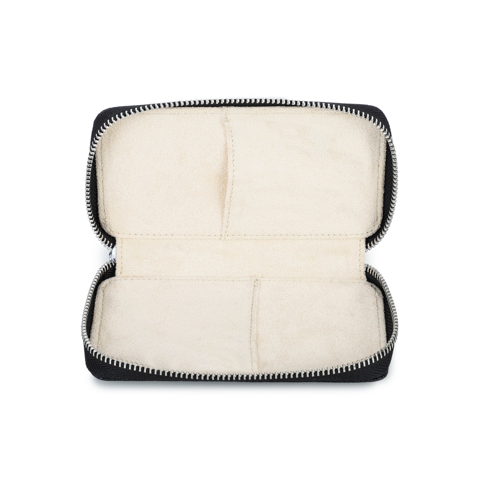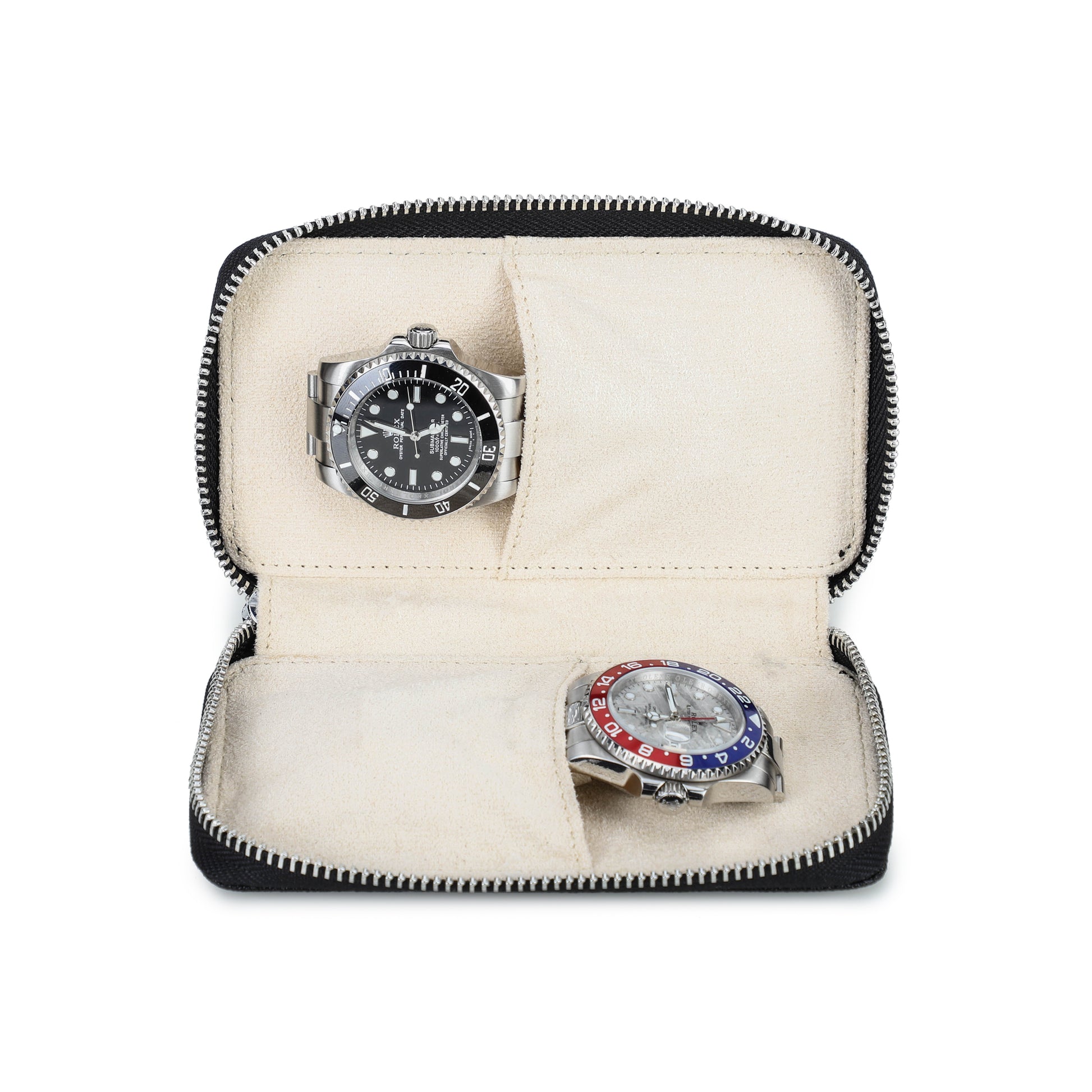 De Timezone Etui is ontworpen om twee horloges veilig op te bergen. Het reisetui kan worden afgesloten met een robuuste ritssluiting, wat ervoor zorgt dat de etui gedurende uw reis veilig dicht blijft.