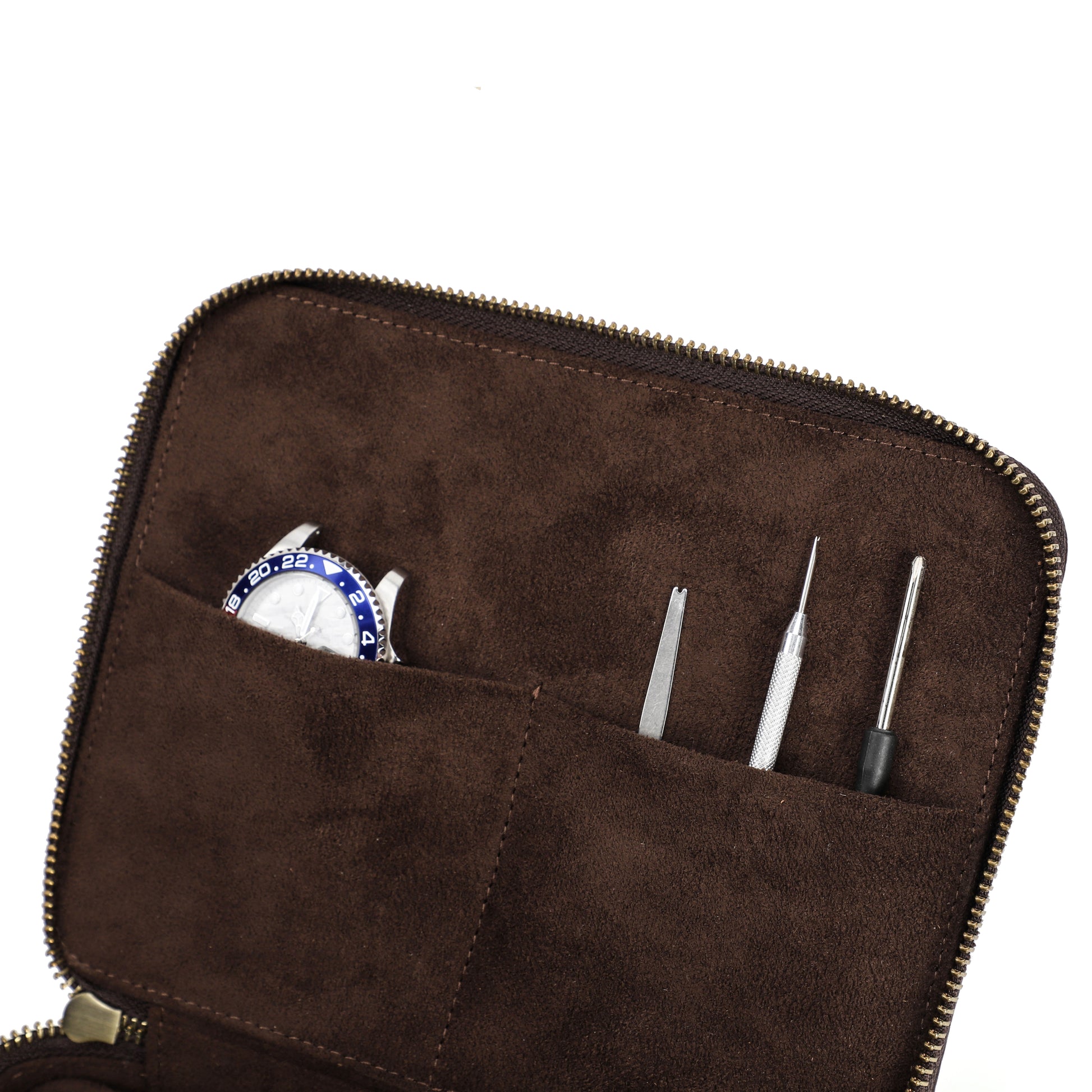De Timezone reisetui is ontworpen om een horloge of Apple Watch op te bergen en extra accessoires zoals horlogebandjes. De buitenkant van de reisetui kan worden gesloten met een stevige rits aan de buitenkant, die ervoor zorgt dat het etui gesloten blijft tijdens het reizen.
