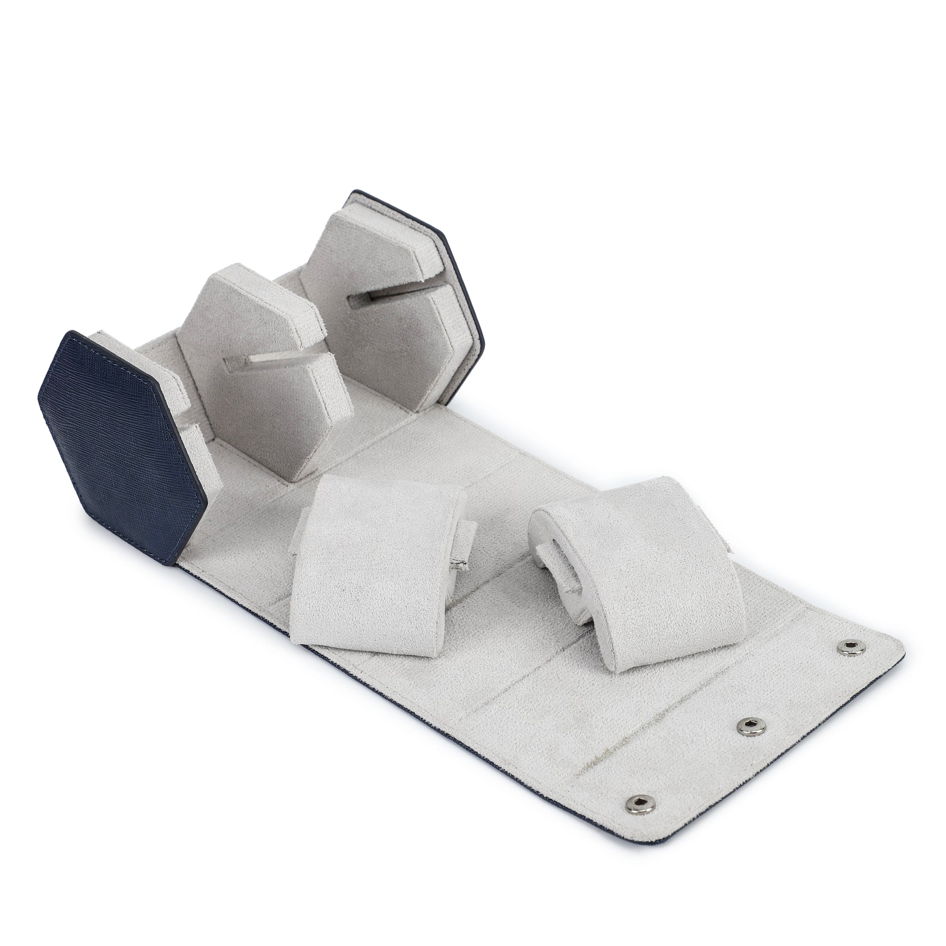 De Timezone watch roll is ontworpen om twee horloges op te bergen. De compartimenten zijn gescheiden om ervoor te zorgen dat uw horloges goed beschermd zijn. De buitenkant van de watch roll kan worden gesloten met drie stevige, externe drukknopen, die ervoor zorgen dat het etui gesloten blijft tijdens het reizen.
