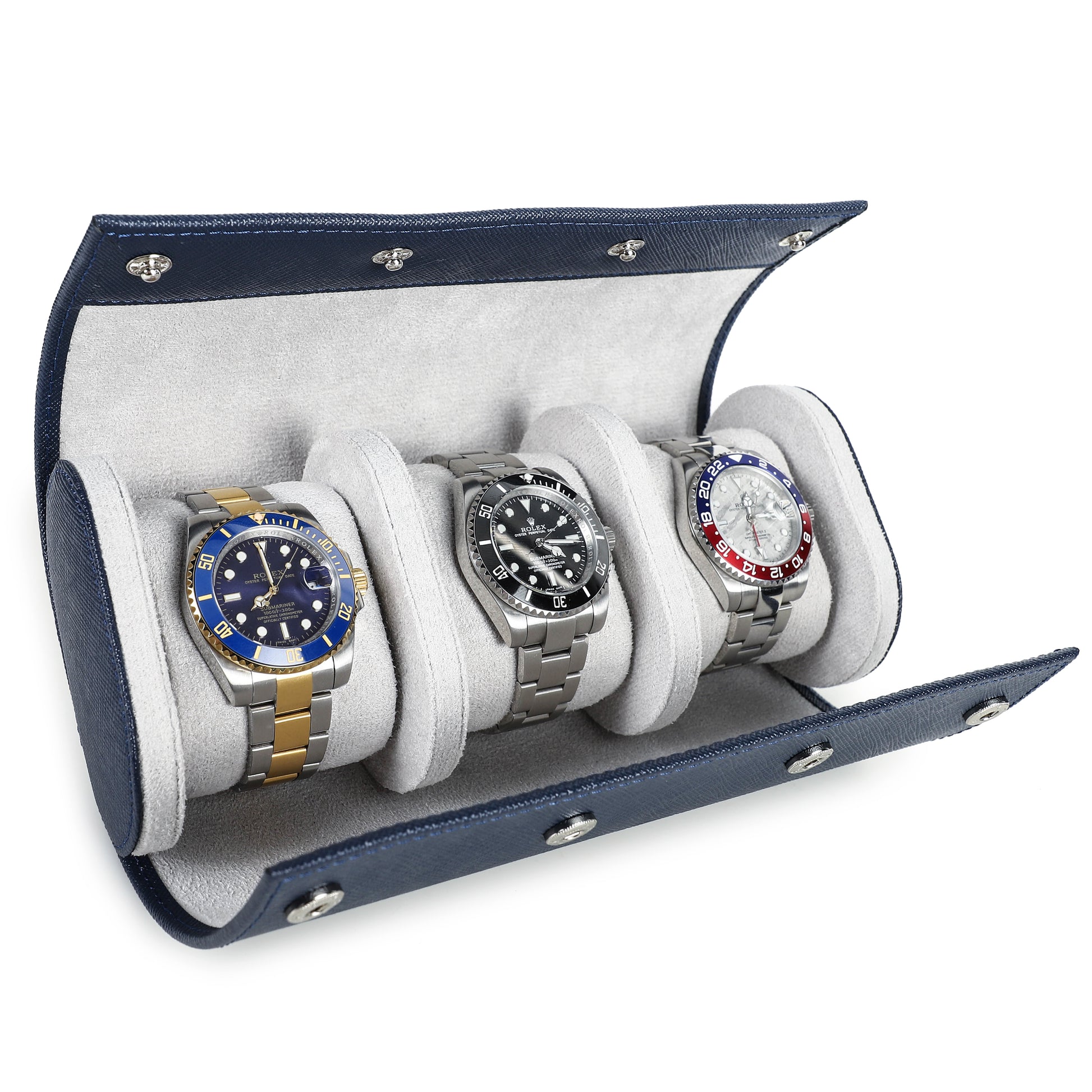 Timezone - Leren Watch roll voor 3 Horloges - Horloge Reisetui - Blauw